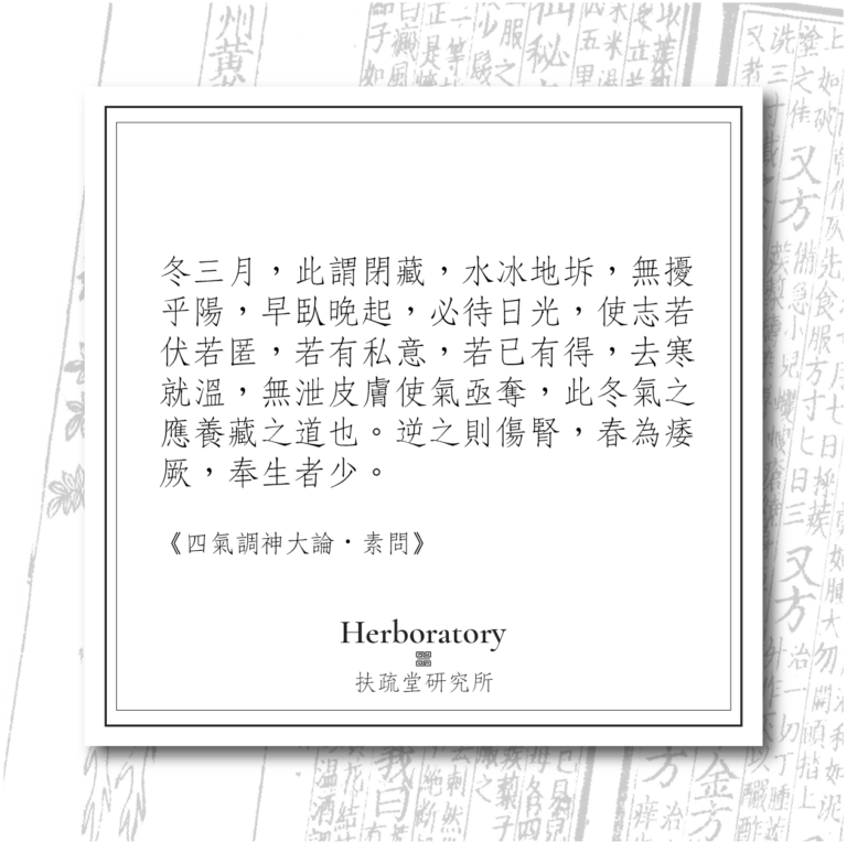 冬季養生,一言以蔽之曰:藏。藏,當然不是當阿宅,而是身心活動量應該儘量減少。有住在東南亞地區的朋友會問「啊我這裡冬天只有旱季啊,溫差沒很大,那我跟著夏天做不也一樣?」很多人以為冬季溫差大、穿厚衣服才算是冬季。地球中氣的流動,不見得以溫度呈現,也可以以濕度等不同氣候現象呈現。在東南亞的冬季,即使不如其他地方需要穿厚衣服,但不代表沒有季節的傾向 - 雨水減少、晚上涼爽舒服等都是地域特有表現。有人問「那暖冬怎麼辦?」,事情反常必有妖,更要注意別被氣候陰到,好好保養身體。